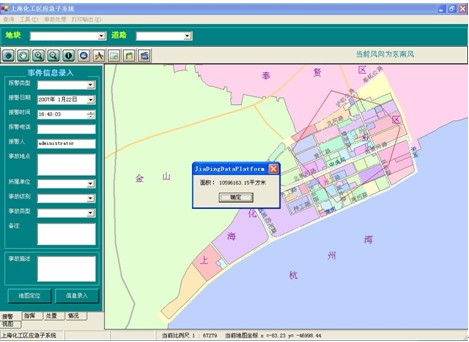 1 影响范围分析:以当前事故点为中心,根据功能窗口上的“紧急隔离半径”和“下风向防备距离”在地图上生成影响范围效果图,红圈表示紧急隔离范围,蓝圈表示防备距离,根据风向的设置,以黄框表示的防备区也将不断进行变化。可通过功能窗口上的信息显示按钮,分别查询三个区域中所有的被影响单位的信息。